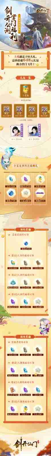 游戏为大家准备了海量的福利,,,,包括上线即可获得的全渠道预约礼包、、、十连抽等福利,,输入密令“JK666”、、、、“JK888”即可领取紫色弟子,,,,达到金丹期后还有功法宝箱可领,,助力全宗上下实力提升……所有奖励总价值超过648元,,而邀请好友一起体验,,,更可以获得额外的奖励哦~
